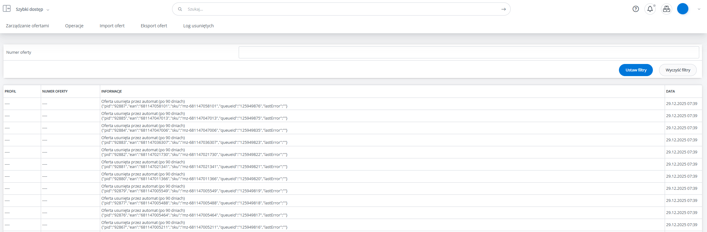 W tej zakładce możemy sprawdzić jakie oferty zostały usunięte z panelu oraz w jaki sposób zostało to dokonane.