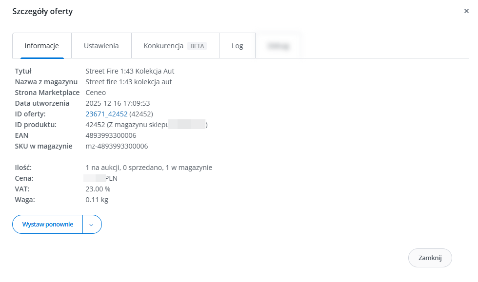 - Sprawdzanie cen konkurencji – operacja ta pozwala na modyfikacje ustawień dotyczacych śledzenia konkurencji i automatyzacji cen na ich podstawie.
