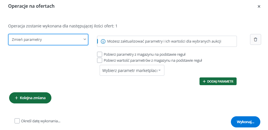 - Aktualizuj oferty (konfigurator) – za pomocą wskazanej operacji możemy zaktualizować parametry dla konkretnej oferty. Możemy wpisać dane ręcznie, bądź pobrać je z produktu na podstawie reguł mapowania parametrów