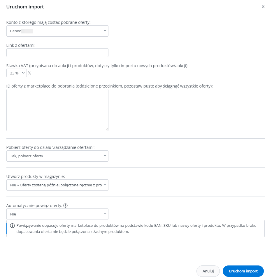 - ID produktu z marketplace do pobrania (oddzielone przecinkiem, pozostaw puste, aby ściągnąć wszystkie oferty)