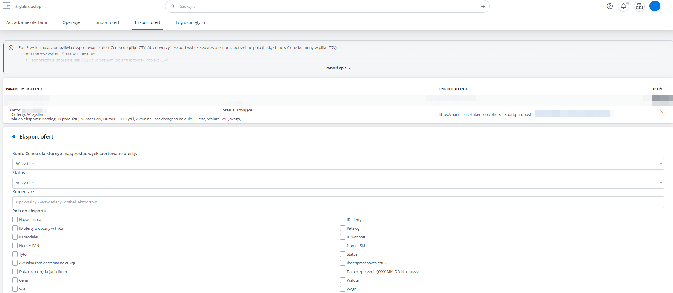 - Eksportuj do pliku – ustawienie to pozwala na eksport danych oferty do pliku .CSV