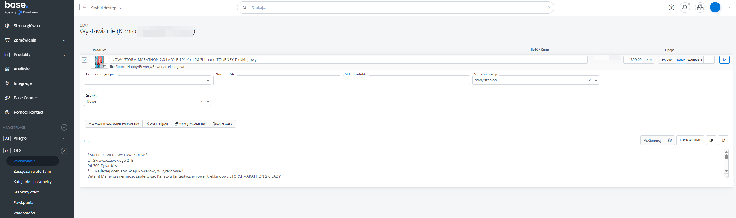 Cena — domyślnie do formularza pobierana jest cena produktu z magazynu. Możesz także dodać mnożnik do ceny pobieranej z magazynu lub dodać/odjąć konkretną kwotę od ceny magazynowej. Konfigurację znajdziesz w Dziale Integracje → Konto OLX → Ustawienia wystawiania → Pole "Mnożnik ceny" / "Dodaj do ceny".