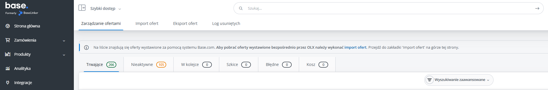 - W kolejce — oferty w trakcie wystawiania na platformie OLX. Po wybraniu pomarańczowego przycisku „Wystaw oferty” na formularzu wystawiania, oferty trafiają do zakładki "W kolejce". Są to oferty wstępnie zwalidowane przez system Base.com i przesyłane na platformę OLX.