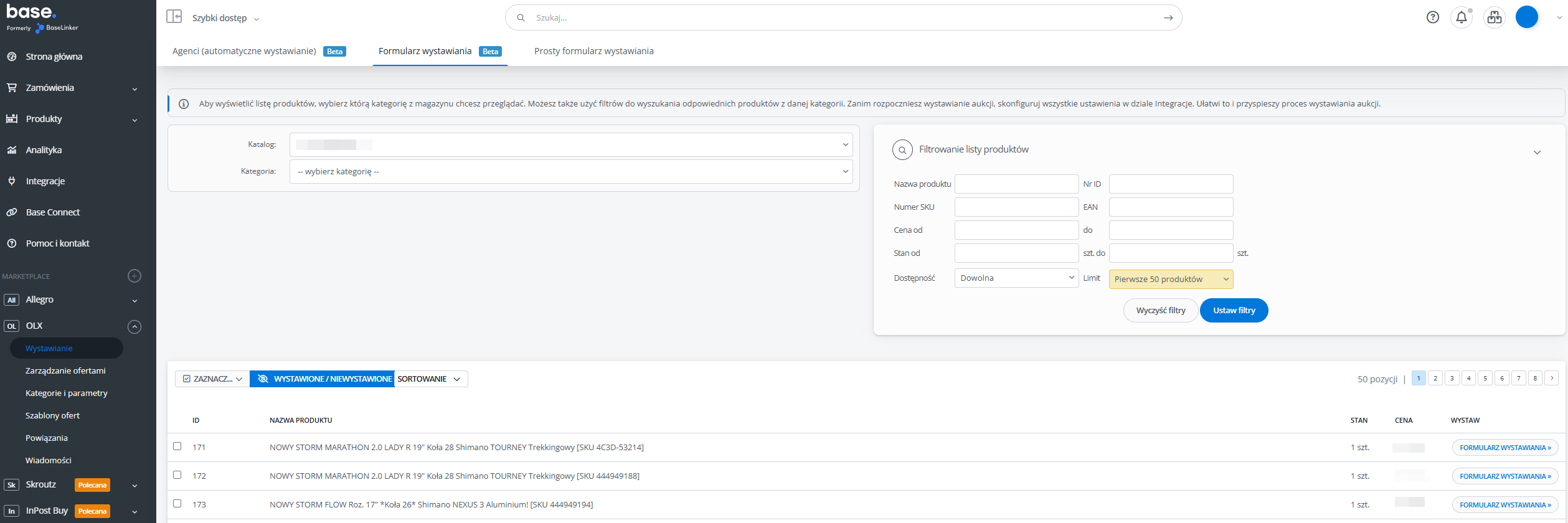 Oferty wystawia się w Dziale OLX→ Wystawianie. Wybierz konto, magazyn oraz kategorię, w jakiej znajdują się produkty, które chcesz wystawić. W tabeli pojawi się wówczas lista produktów. Możesz ją przefiltrować po określonych parametrach oraz zadecydować ile produktów wyświetli się na jednej stronie.