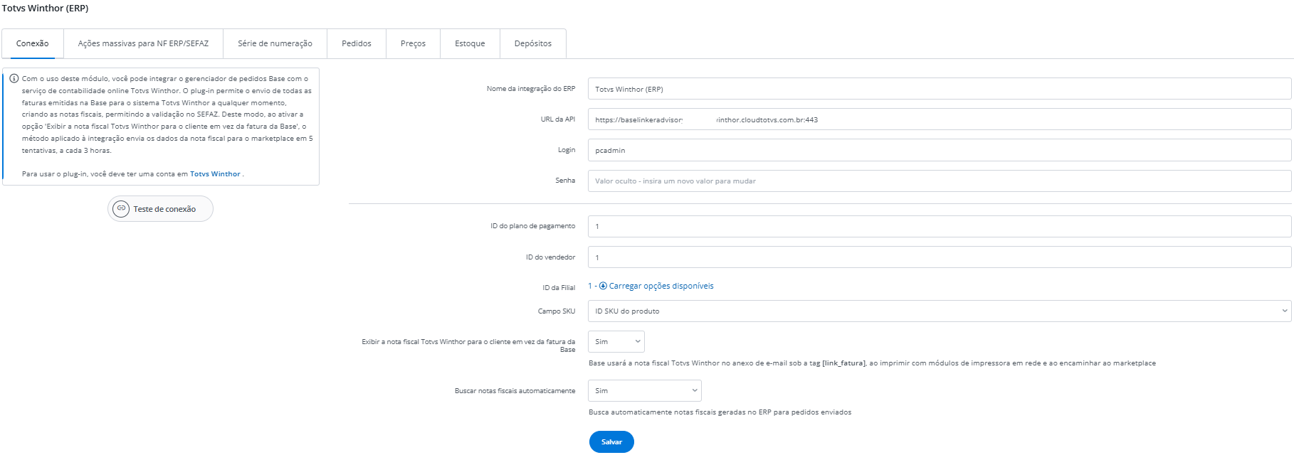Assim como em outras integrações TOTVS, a Base utiliza login e senha específicos do serviço correto, que neste caso são os dados do Winthor Anywhere. Isso é essencial porque o Winthor e o Winthor Anywhere são serviços distintos no ecossistema TOTVS.