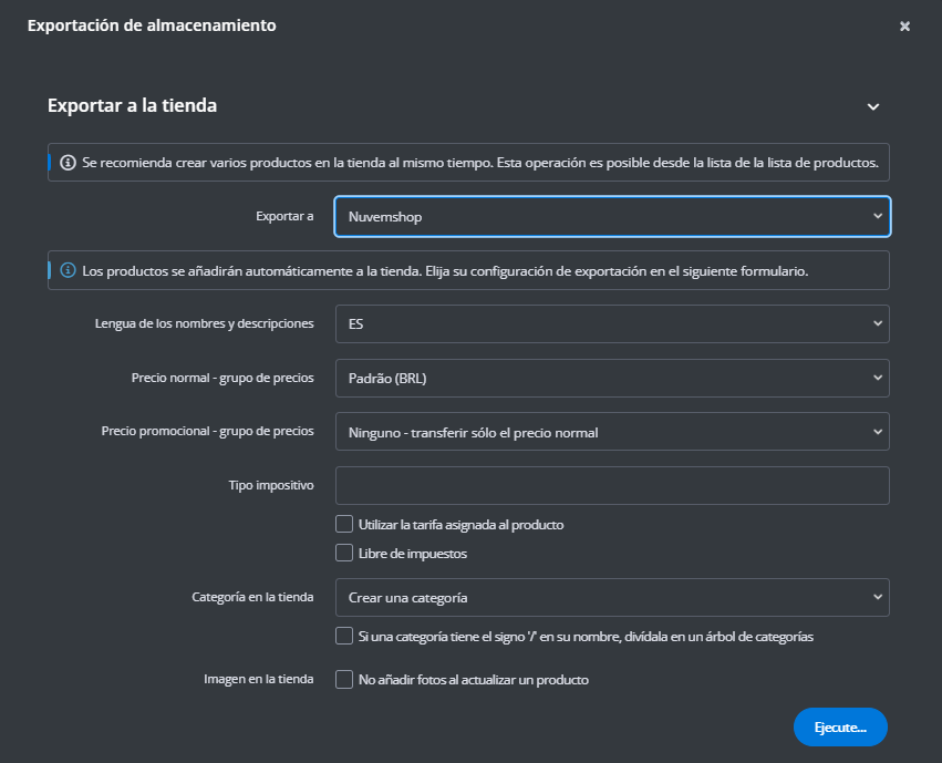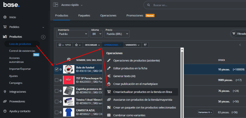 - Haga clic en “Operaciones” y luego en “Crear/Actualizar productos en la tienda online