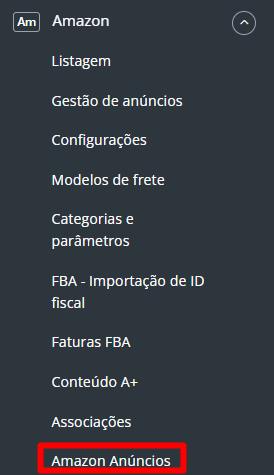 Além disso, após a autenticação, será habilitado no menu lateral esquerdo o botão Amazon Ads.