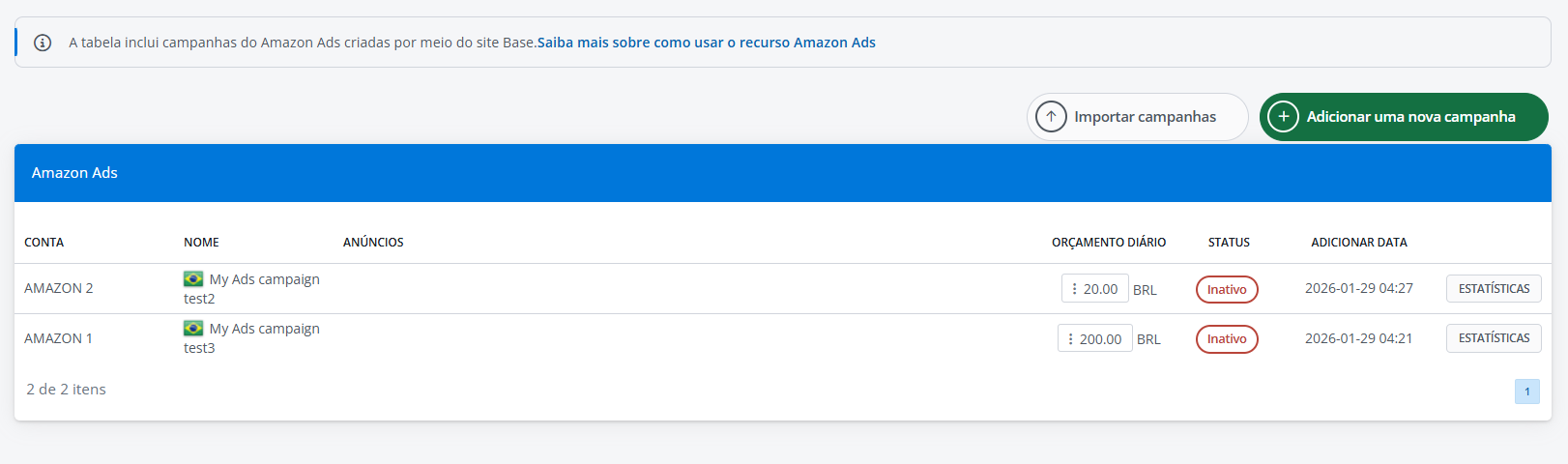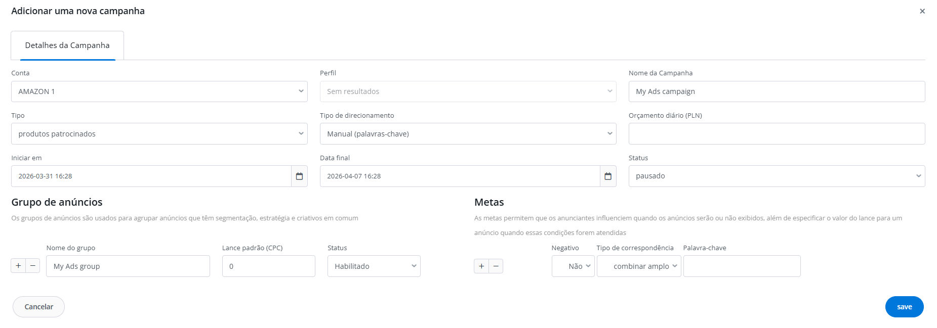Permite trazer para a Base campanhas já existentes na conta da Amazon. - Criar nova campanha
