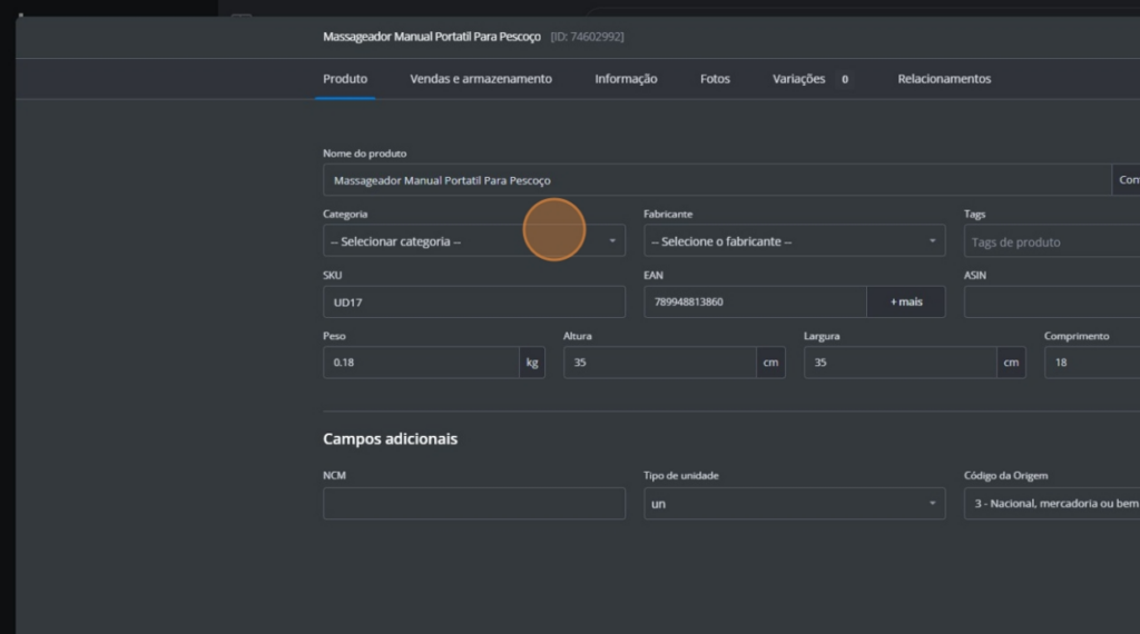- Na primeira abinha (“Produto”), procure o campo “Categoria“.