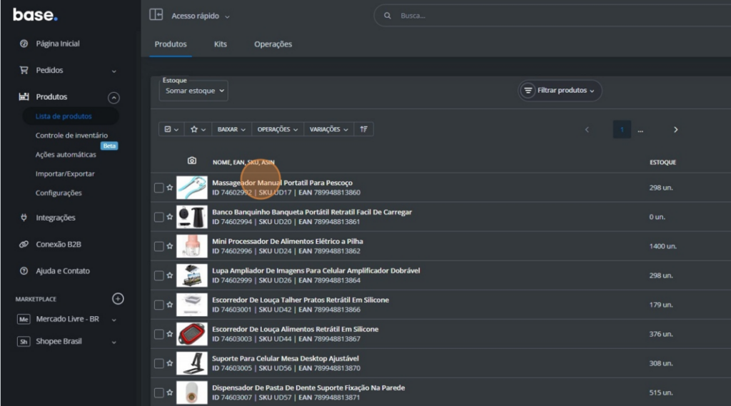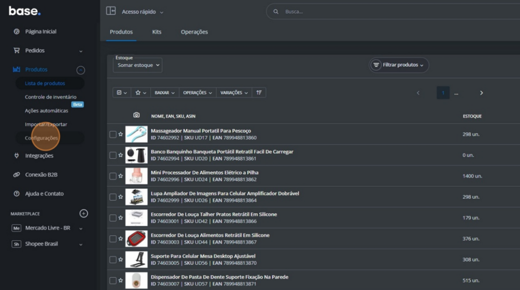 - No menu do lado esquerdo, encontre o nome do site de vendas onde você quer anunciar (ex: “Shopee Brasil”, “Mercado Livre – BR”).