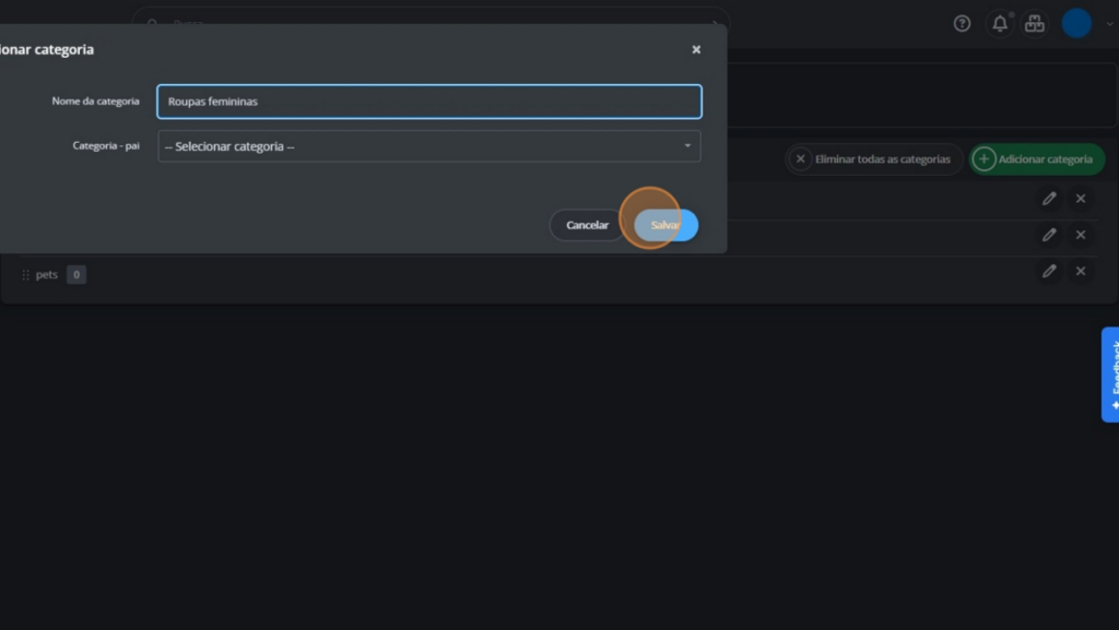 - Criando Novas: Para adicionar uma categoria que você precisa, clique no botão verde “+ Adicionar categoria“, digite o nome dela (ex: “Roupas Femininas”, “Eletrônicos”) e salve.