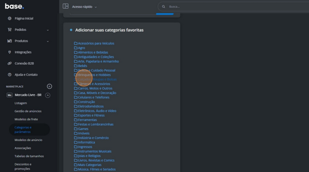 Olá! Sabe quando você vai anunciar um produto e precisa escolher a “gaveta” certa (a categoria) para ele no site de vendas? Este guia vai te mostrar como fazer isso de um jeito mais fácil e automático aqui na plataforma Base! Assim, quando você for criar seus anúncios, a categoria já vai estar no lugar certo.