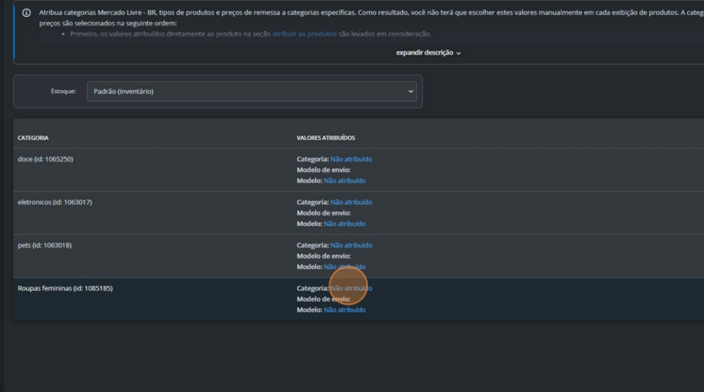 - Na coluna da direita, ao lado de cada categoria sua, tem um campo que pode estar escrito “Não atribuído”. É aqui que você vai escolher a categoria correspondente do site de vendas.