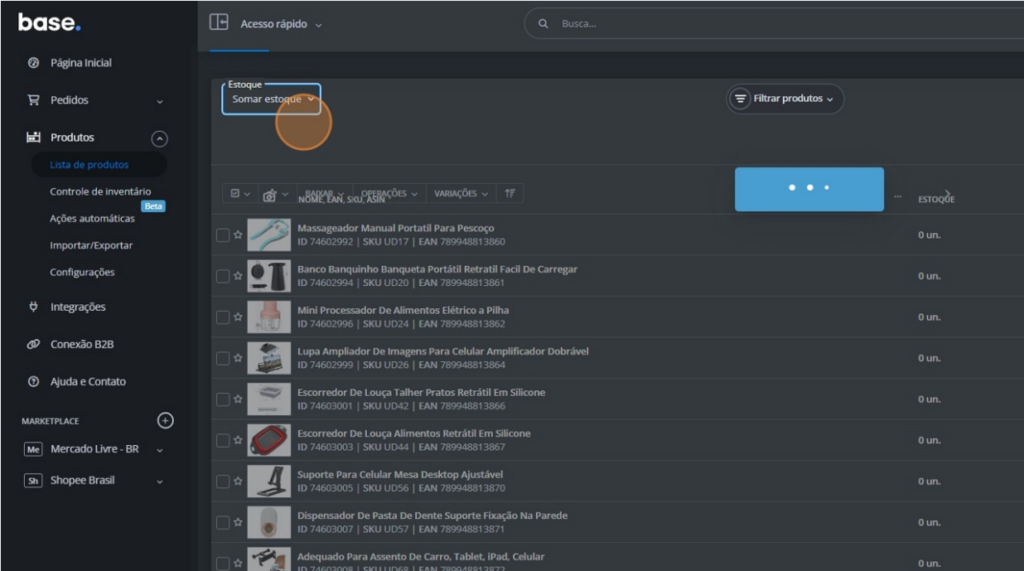 - Ao olhar sua lista de produtos, você pode notar que muitos deles mostram “0 un.” (zero unidades) na coluna “ESTOQUE”.