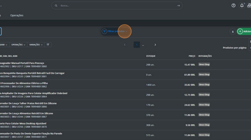 - Clique no botão “Filtrar produtos” (geralmente acima e à direita da lista de produtos).