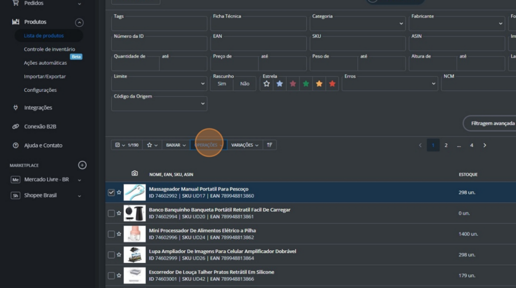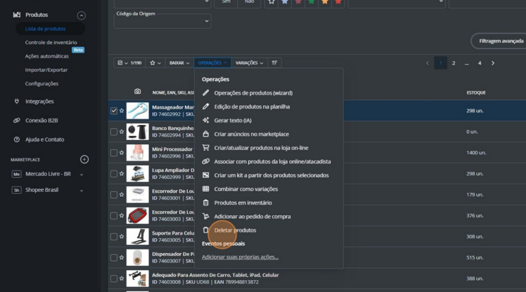 - Clique no botão “OPERAÇÕES” (que aparece acima da lista de produtos após selecionar algum item).