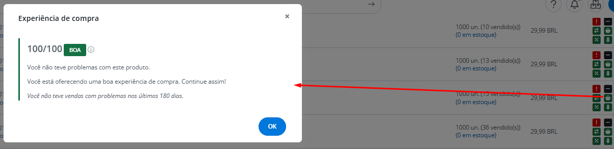 Ao clicar no ícone da cesta de compras, o sistema exibe uma mensagem explicando o nível atual da experiência de compra daquele anúncio.