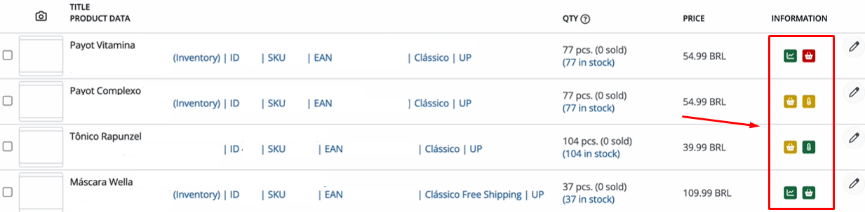 Na tela de Gestão de Anúncios, dentro da coluna de informações, alguns anúncios exibem um ícone em formato de cesta de compras. Esse ícone indica o nível da experiência de compra daquele anúncio.