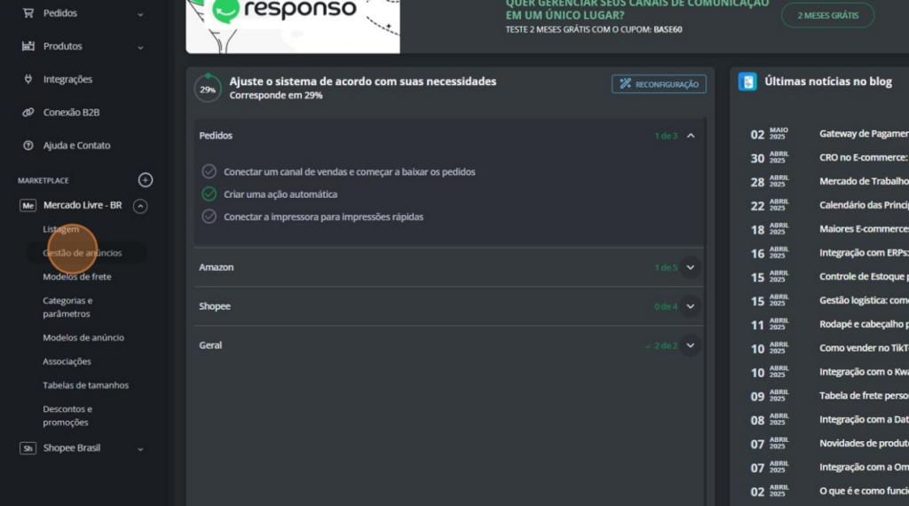 - No menu do lado esquerdo, encontre o nome do marketplace que você quer gerenciar (Ex: “Shopee Brasil”, “Mercado Livre – BR”).