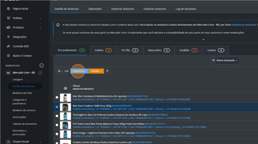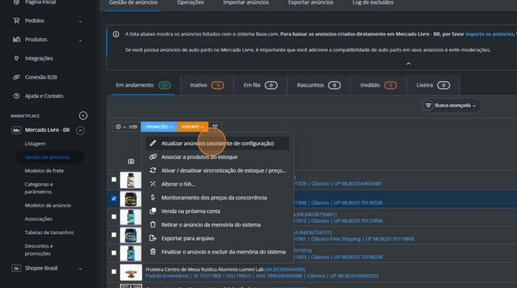 - Economia de Tempo: Em vez de entrar em cada anúncio no marketplace para mudar um preço ou descrição, você faz tudo de uma vez para vários itens direto pela Base.