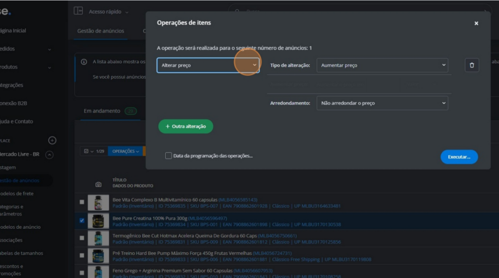 - Depois de escolher a operação (Ex: “Alterar preço”), preencha os campos que aparecem abaixo com os novos detalhes (Ex: “Diminuir preço”, valor “5”, tipo “%”).