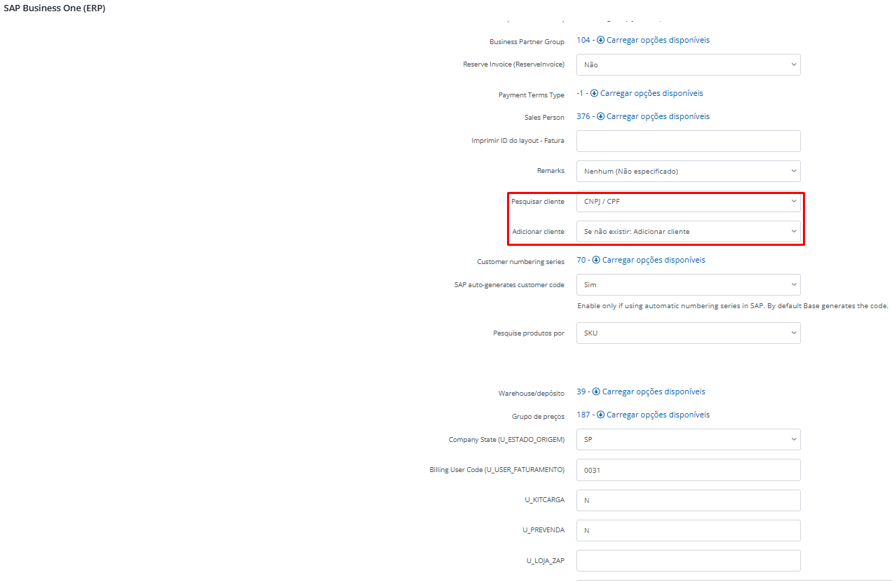 Devido ao alto nível de personalização do SAP, nem todas as regras e campos viram parâmetros padrão na integração.