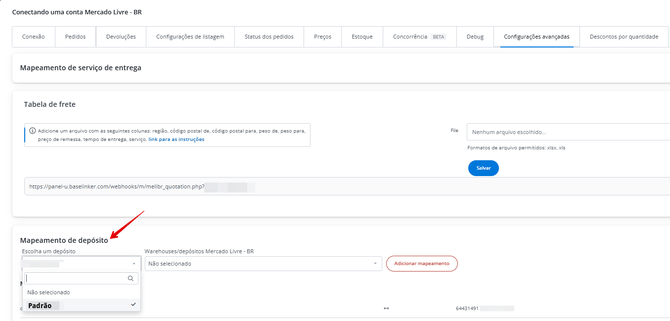 Primeiramente, faça o mapeamento dos depósitos do Mercado Livre com os armazéns da Base.