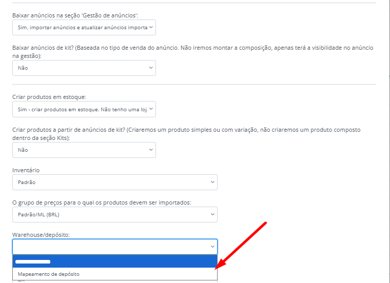 Além disso, no momento da importação de anúncios, você pode definir de onde o estoque será considerado.