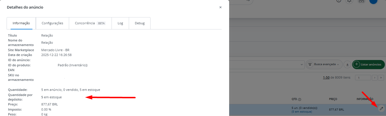 Na tela de anúncios, ao clicar no ícone de edição (lápis) e acessar os detalhes da oferta, o sistema mostra a quantidade de estoque separada por depósito.