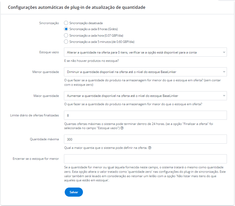 O módulo de sincronização de estoque é responsável pela relistagem automática dos anúncios da Amazon, por exemplo. Você pode ativá-lo e configurá-lo em Integrações → Conta Marketplace → Configurações → Estoque.