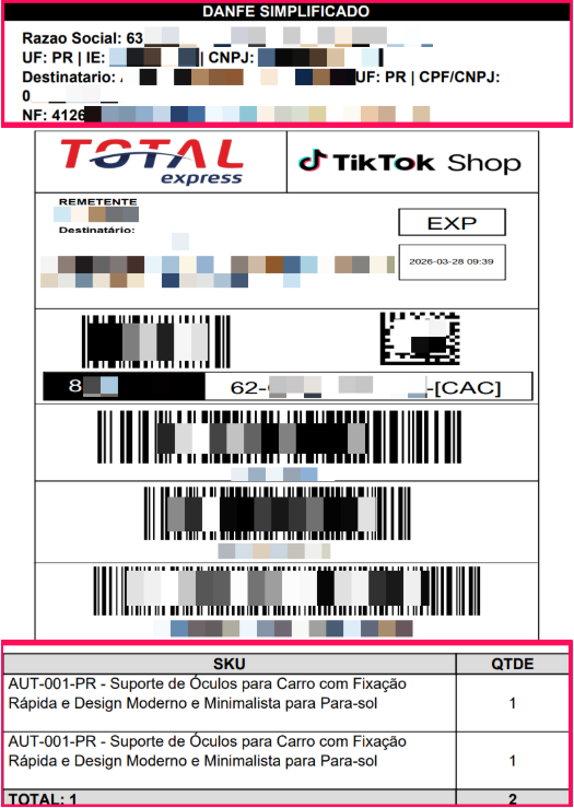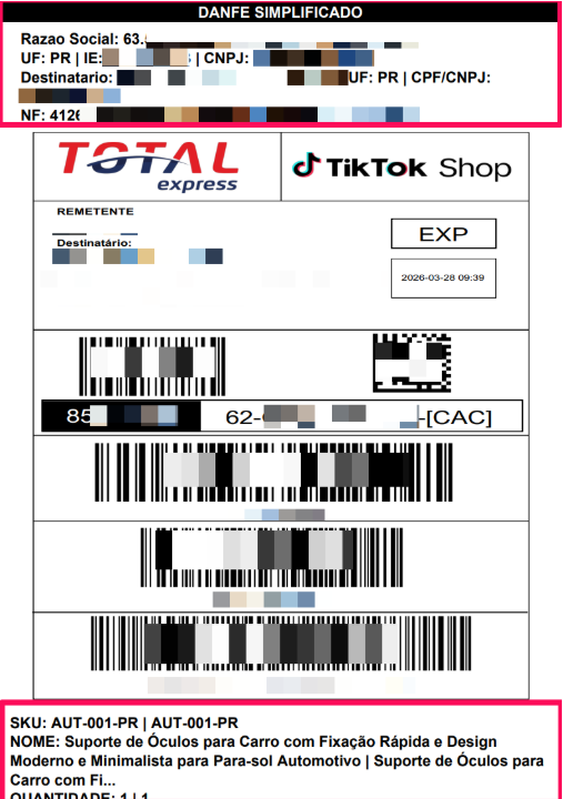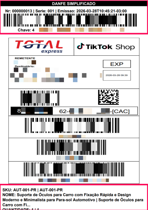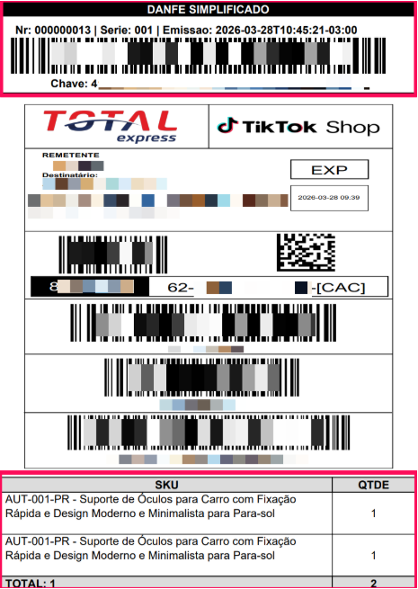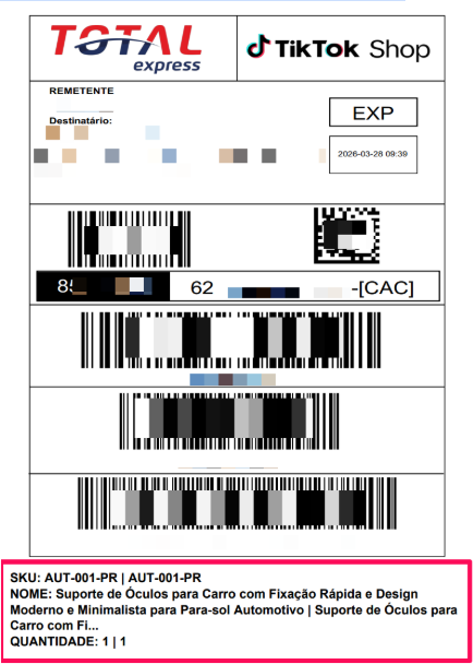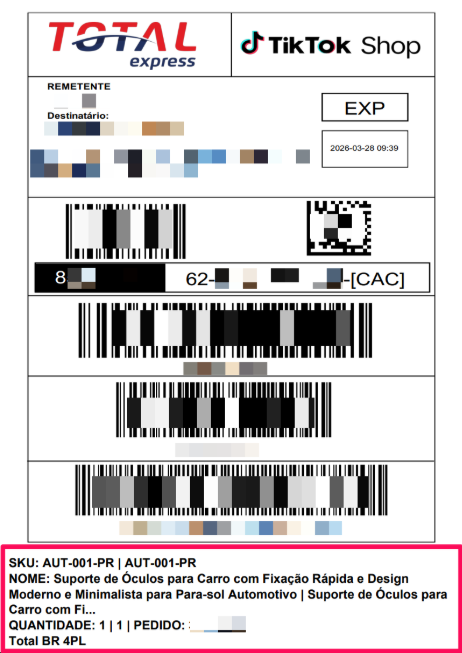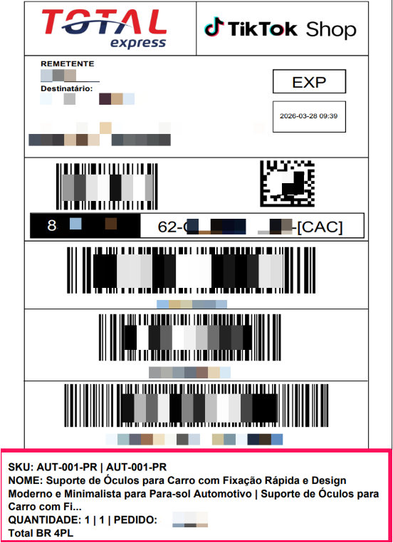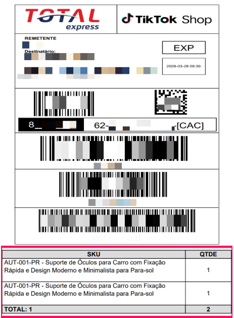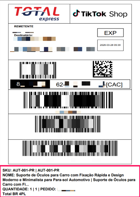 Rodapé 3 – SKU, descrição, quantidade, ID do pedido e nome da transportadora.