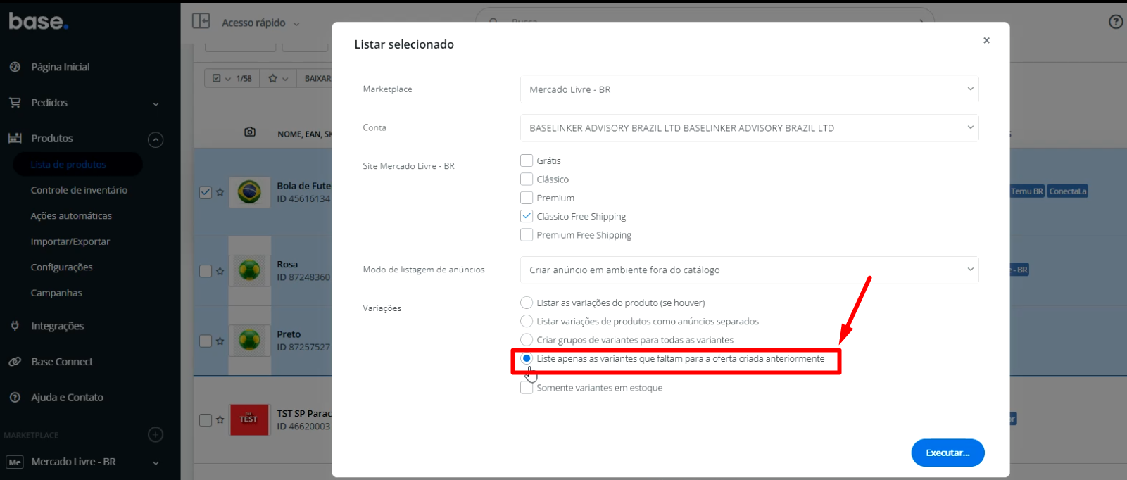 A Base disponibilizou uma nova opção para quem gerencia anúncios com variações no Mercado Livre: “Liste apenas as variantes que faltam para a oferta criada anteriormente”. Com essa melhoria, o processo de adicionar novas variações ficou mais rápido, seguro e organizado; além disso, reduz retrabalho e evita erros.