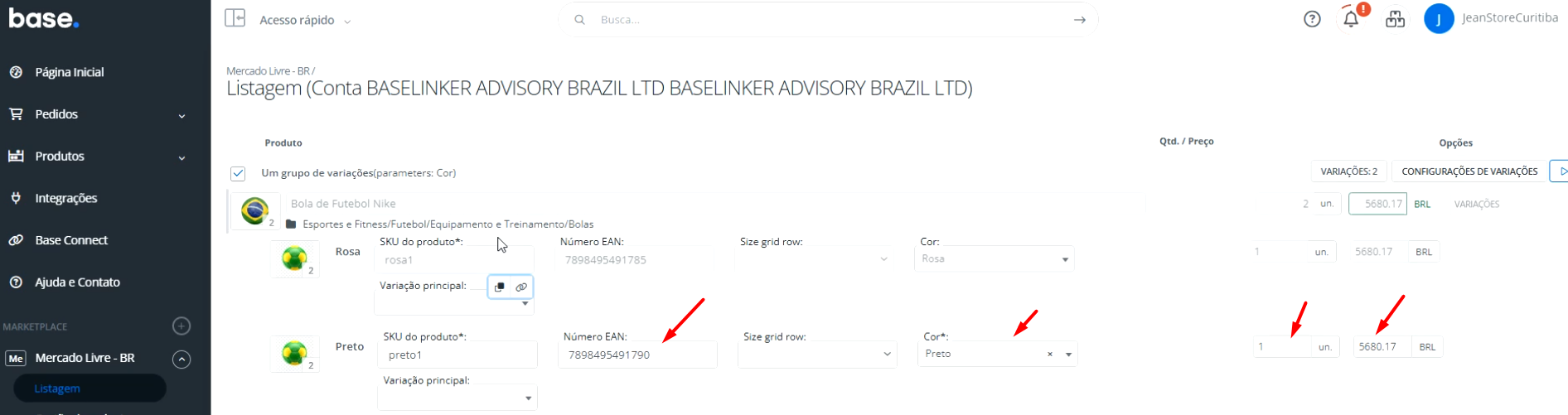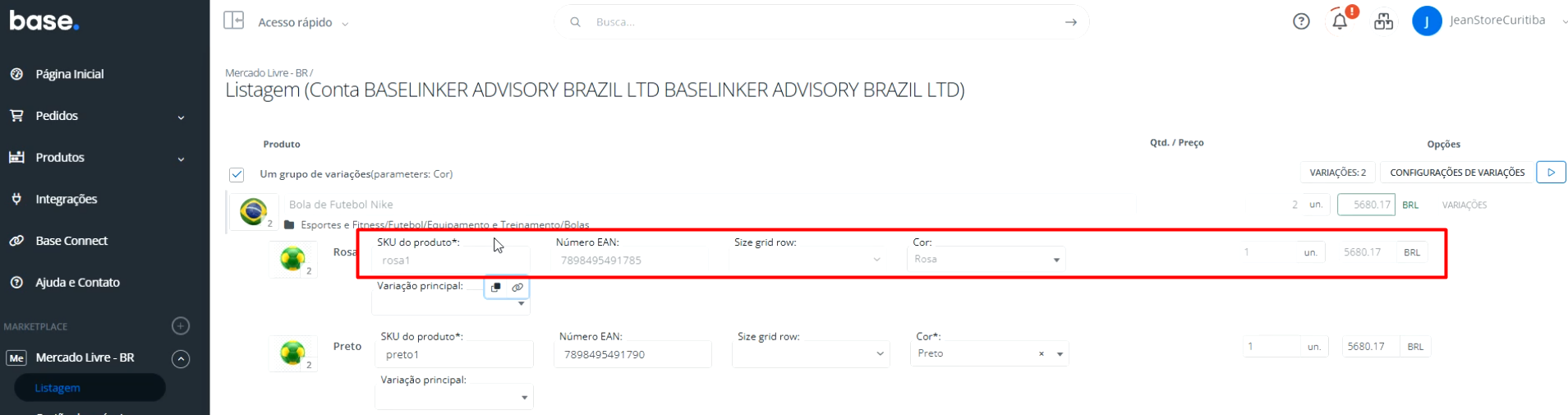 É necessário informar preço, título, EAN, atributo diferenciador e estoque. Além disso, essas informações garantem que a variação fique correta no Mercado Livre.