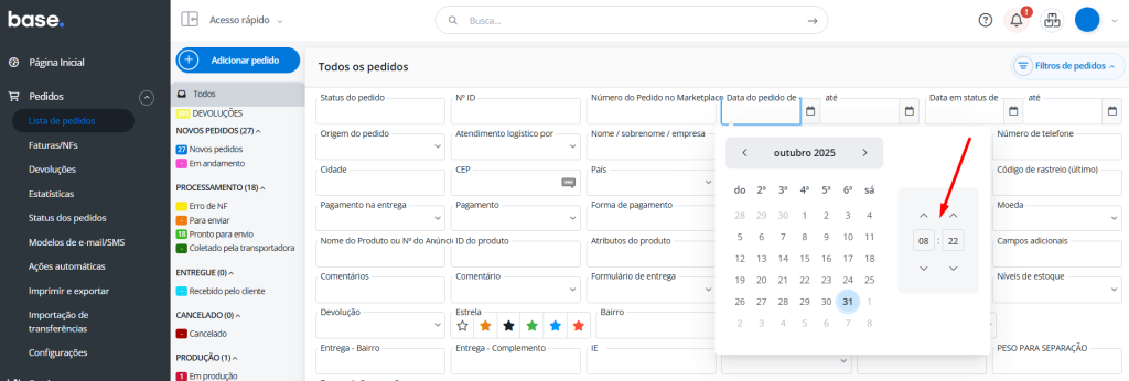 A Base ganhou mais uma melhoria para facilitar a gestão dos pedidos! Agora, na tela de Pedidos, é possível filtrar os resultados também por hora do pedido.