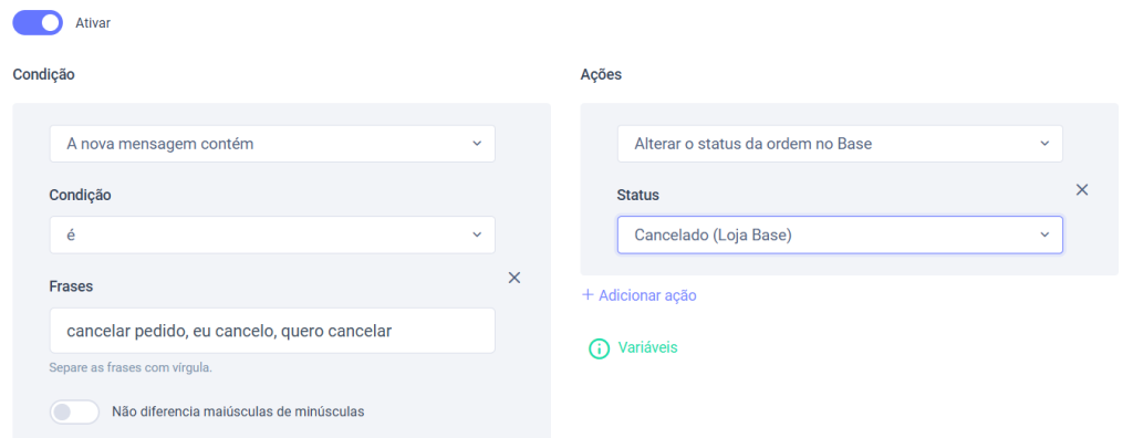 Se o cliente enviar mensagens contendo termos como “cancelar pedido”, “eu cancelo”, “quero cancelar”