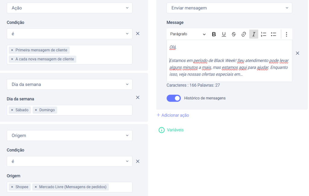 Nem toda automação precisa ser complexa; algumas, inclusive, geram impacto enorme com pouco esforço. Durante períodos como Black Friday, por exemplo, uma simples resposta automática reduz filas e orienta o cliente antes mesmo de falar com alguém.