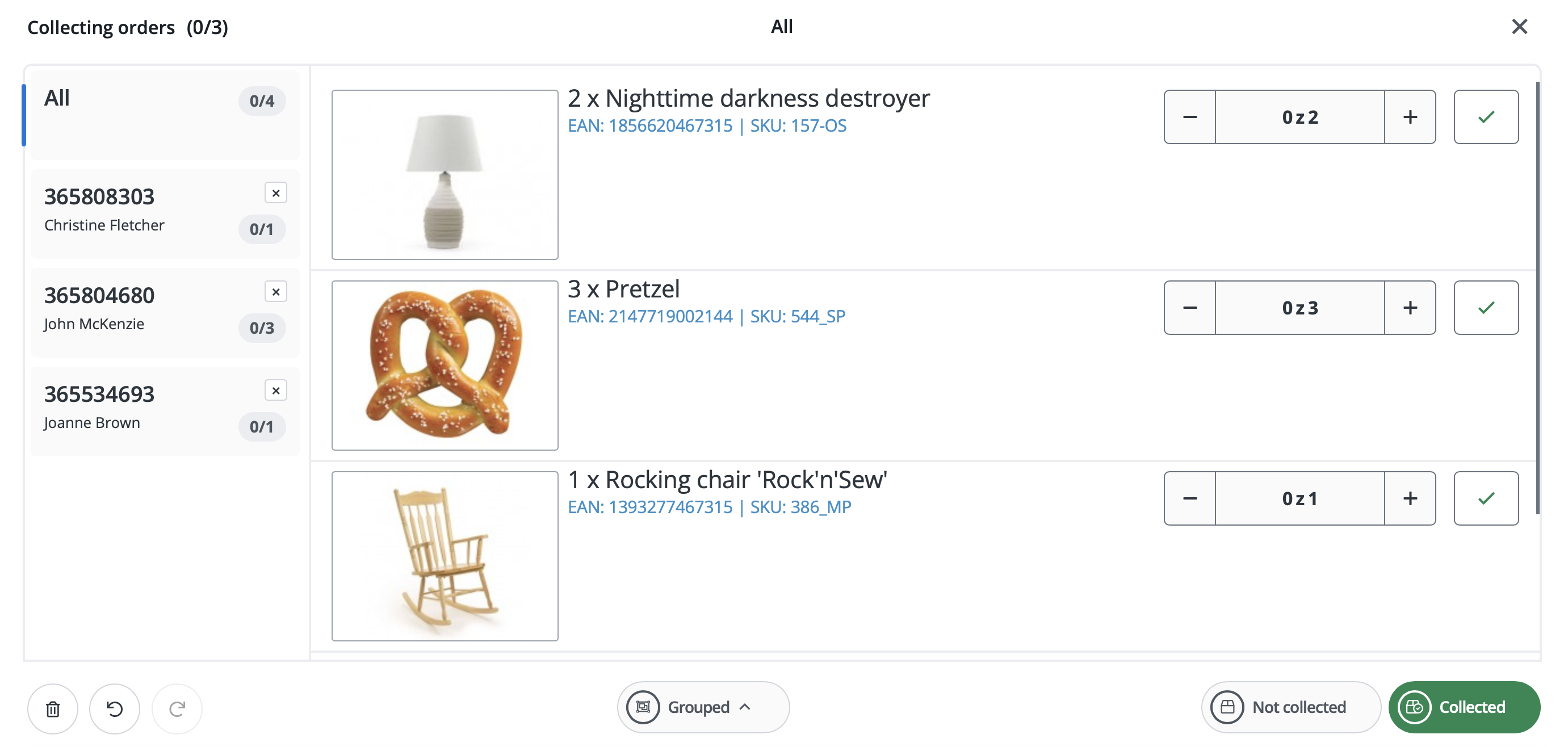 Comanda pentru care nu a fost încă ambalat niciun produs este marcată cu alb. Comenzile care sunt în curs de ambalare sunt marcate cu galben, iar cele care au fost finalizate – cu verde.