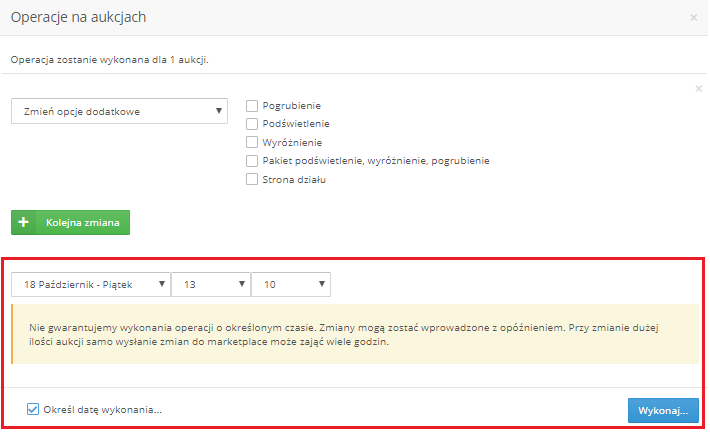 Natomiast należy pamiętać, że nie gwarantujemy wykonania operacji o określonym czasie. Zmiany mogą zostać wprowadzone z opóźnieniem. Przy zmianie dużej ilości aukcji samo wysłanie zmian do marketplace może zająć wiele godzin.