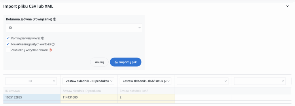 - 然后创建另一个 CSV 文件,其中包含套件的组件和之前创建的 “父 ”的 ID 编号。在给出的示例中,套件中包含的产品已在仓库中创建(ID 114131680)。