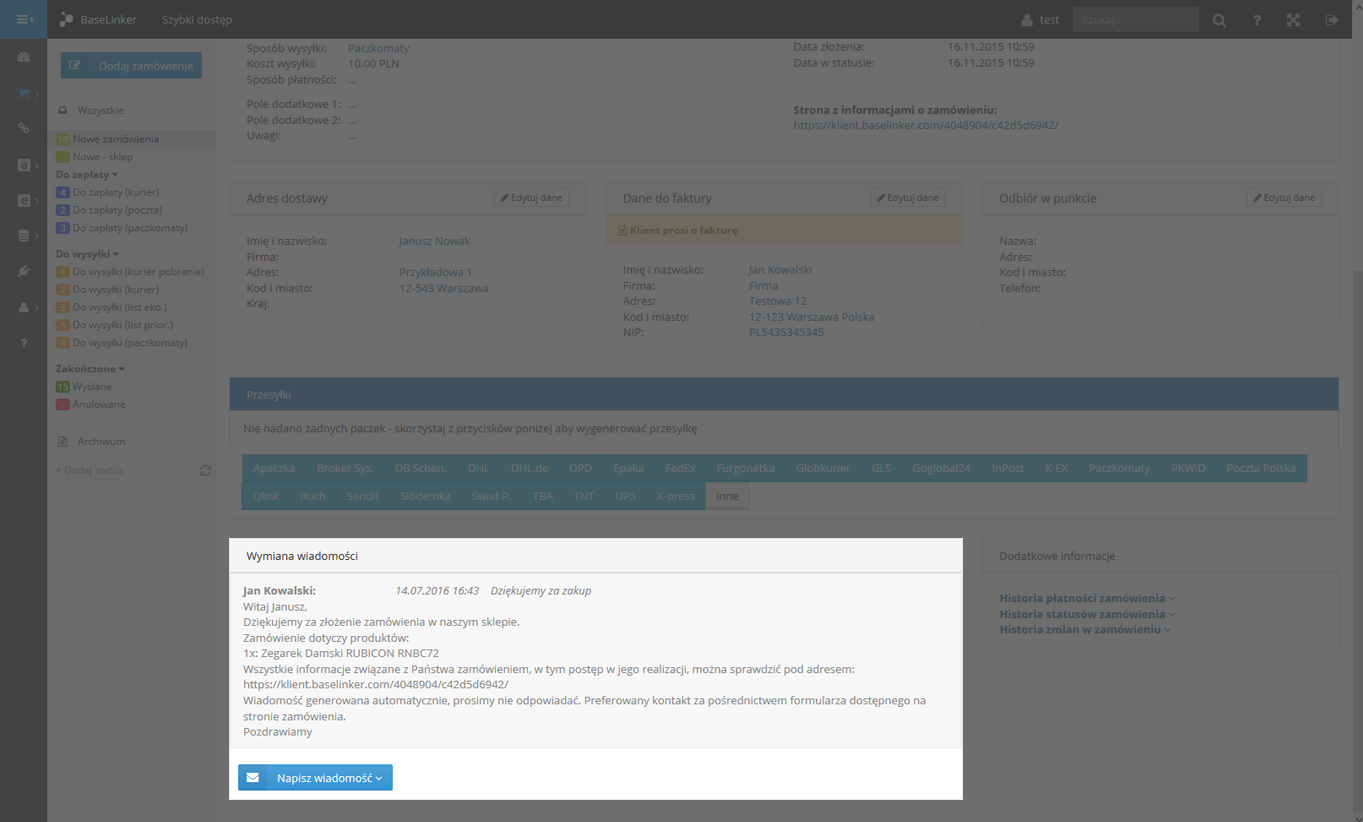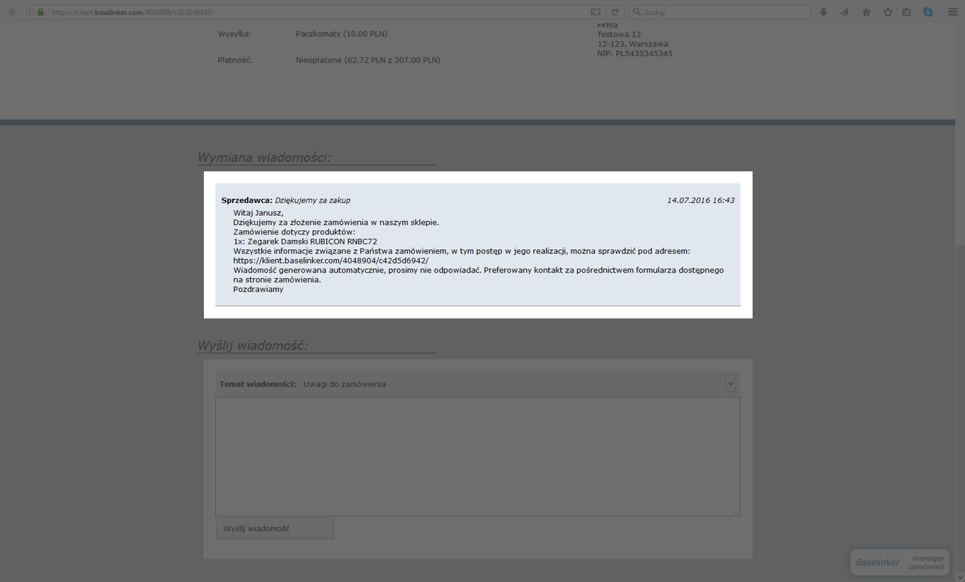 - 在Base.com系统内 – 通过订单页面上的表格。在这种情况下,建议在发送给客户的电子邮件中包含消息“此消息为自动生成,请勿回复。首选通过订单页面上的表格进行联系。”
